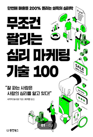 안녕하세요 힐링라일라입니다 ^^우리는 무엇을 팔든 사람을 대상으로 하게 됩니다. 평소 '이렇게 하면서 먹히더라' 막연한 카더라로 알고 있었다면 무조건 팔리는 심리 마케팅 기술을 100가지로 총망라한 이 책에 주목해 보세요. 여러분도 이제 뭐든 잘~ 팔게 될겁니다. 이 책은 총 5장으로 구성되어 있으며 1장에서는 평범한 물건도 좋아보이게 만드는 심리 마케팅 기술, 2장에서는 내 물건을 사게 만드는 17가지 카피의 기술, 3장에서는 상대에게 호감을 사서 친해지는 심리 마케팅 기술, 4장에서는 모두를 사로잡는 프리젠테이션 노하우 11가지, 5장에서는 마침내 상대의 마음을 얻고 매출도 올라간다로 구성되어 있습니다.